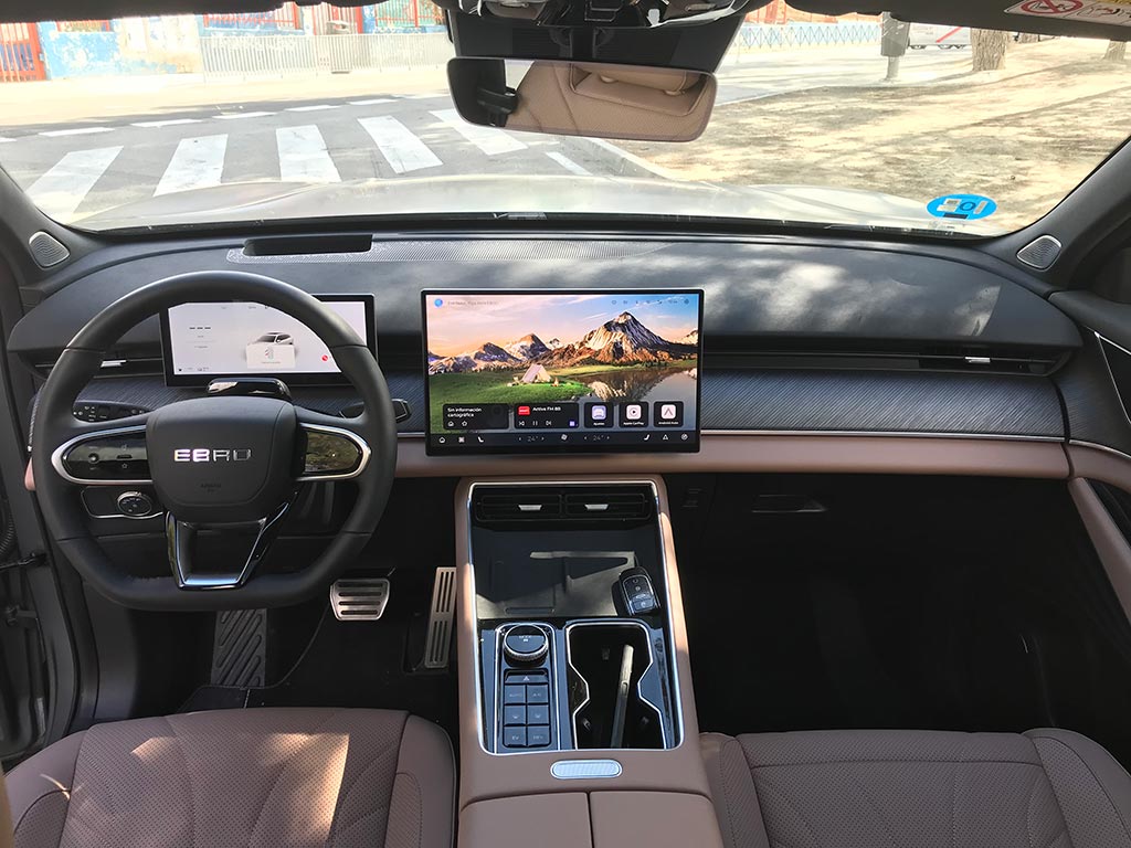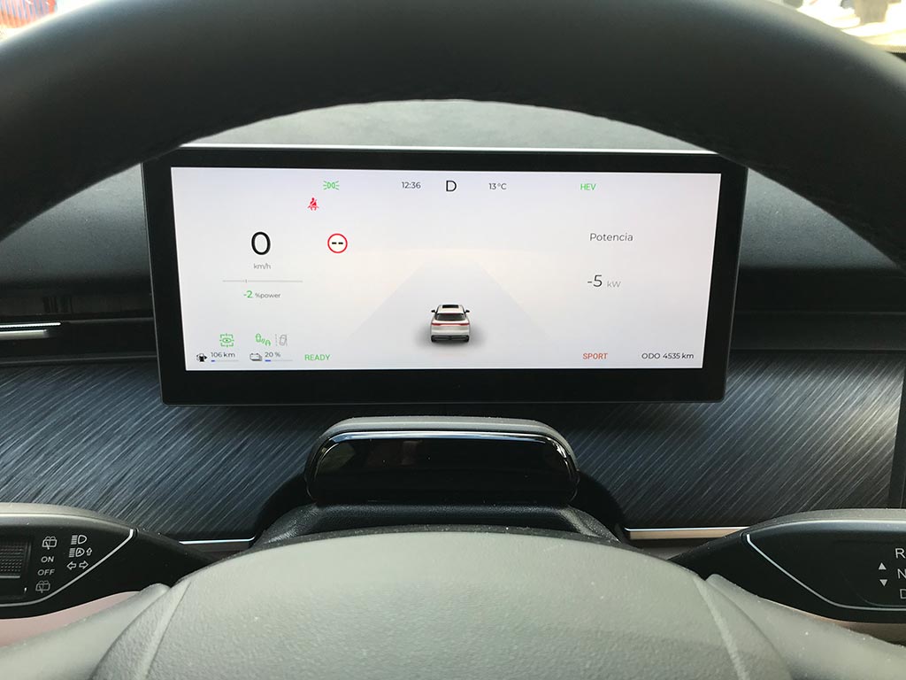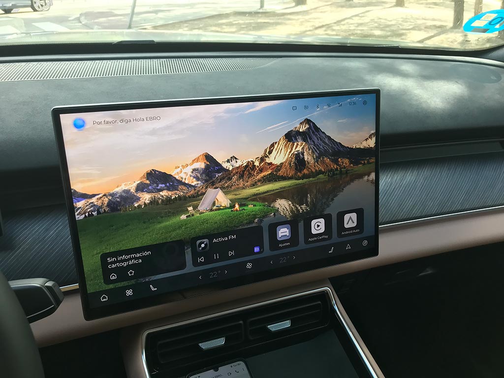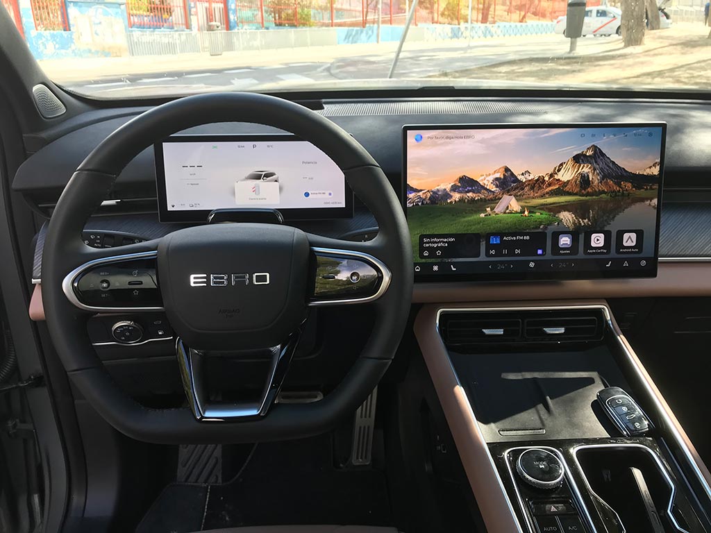 Empezamos por el volante, de un diámetro perfecto, y con un tacto sensacional; es de tres radios y muy acertadamente con botones físicos. Por detrás de él, el cuadro digital de 10,25 pulgadas, con toda la información relativa a nuestro Ebro s900 y de una calidad de gráficos muy buena y el Head-up display de 8,8 pulgadas, con proyección en el parabrisas, configurable, y de muy buena visibilidad.