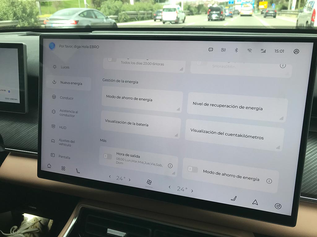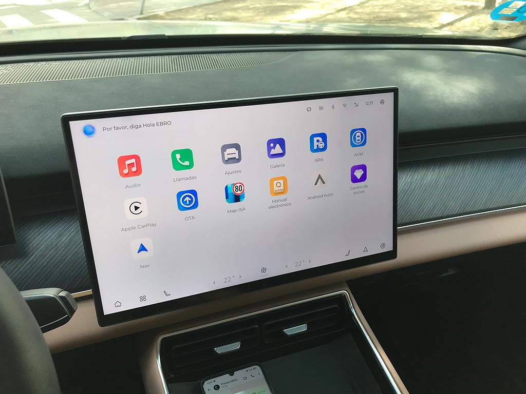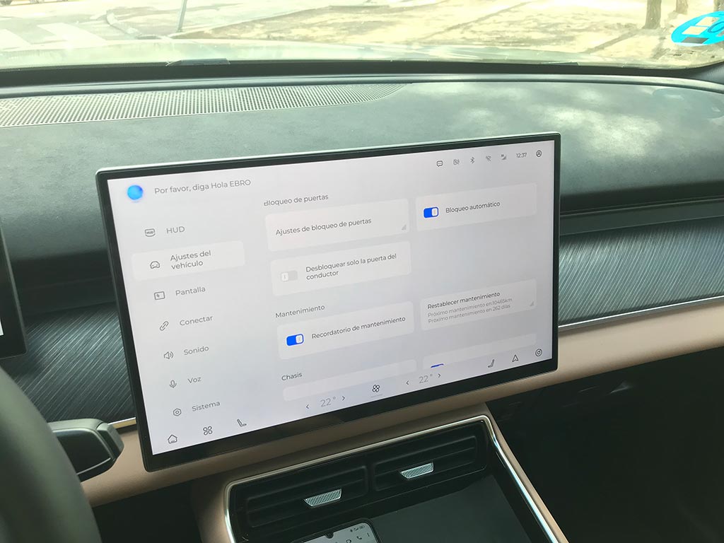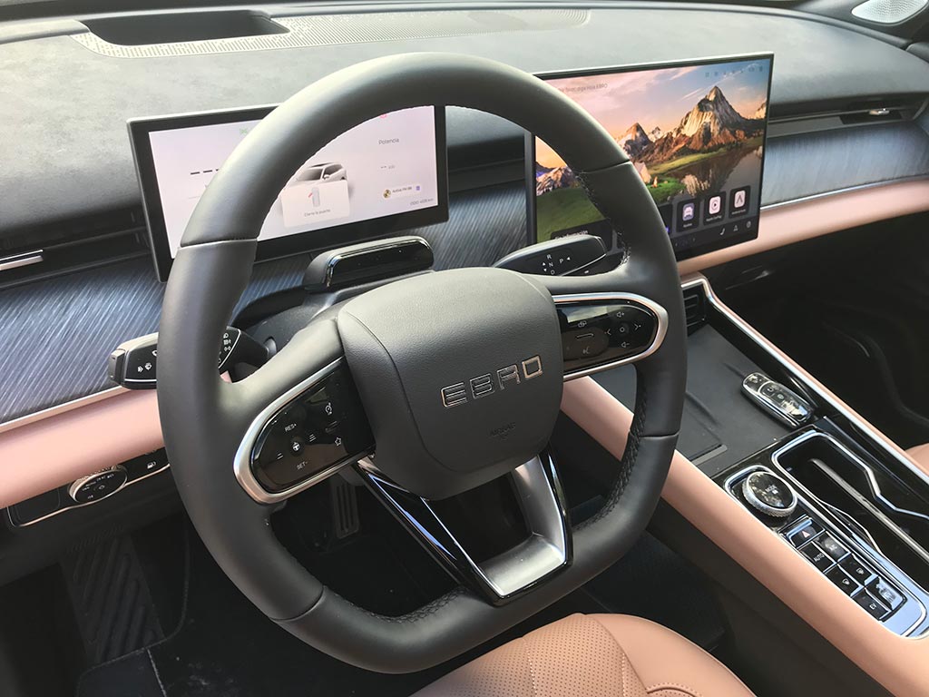 Empezamos por el volante, de un diámetro perfecto, y con un tacto sensacional; es de tres radios y muy acertadamente con botones físicos. Por detrás de él, el cuadro digital de 10,25 pulgadas, con toda la información relativa a nuestro Ebro s900 y de una calidad de gráficos muy buena y el Head-up display de 8,8 pulgadas, con proyección en el parabrisas, configurable, y de muy buena visibilidad.