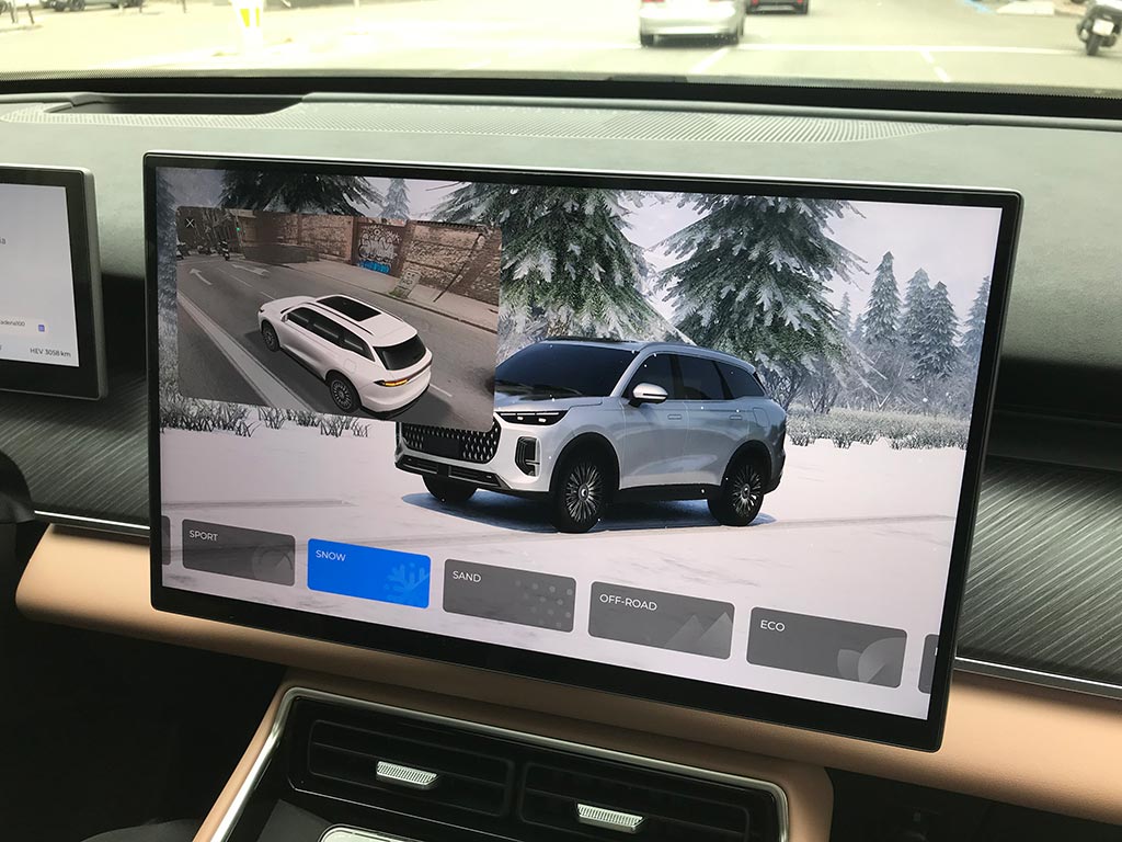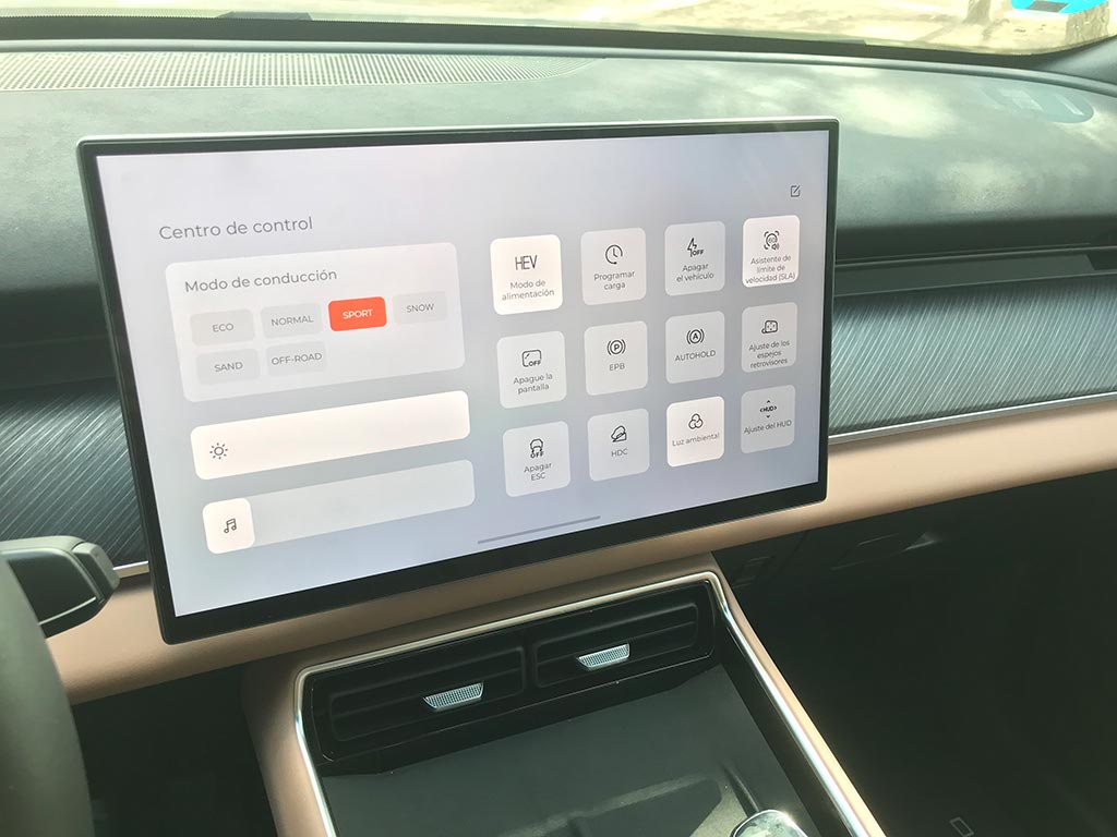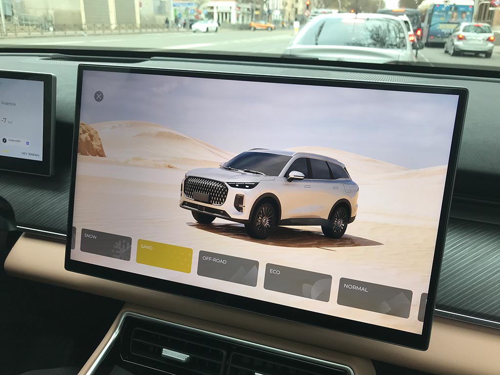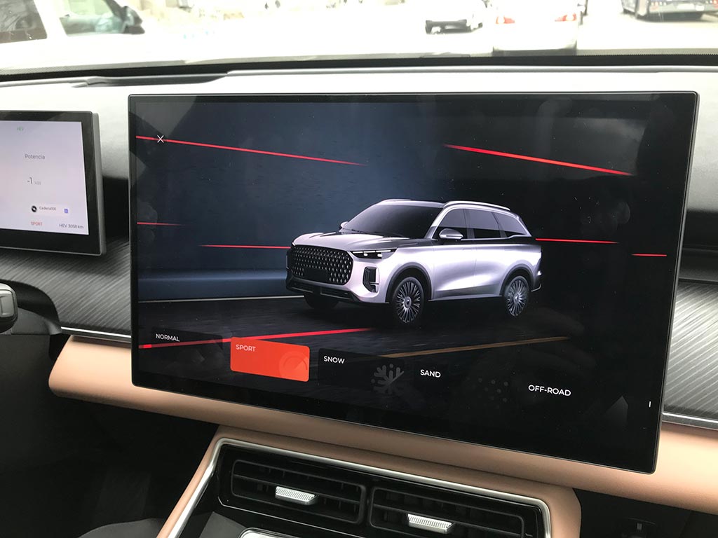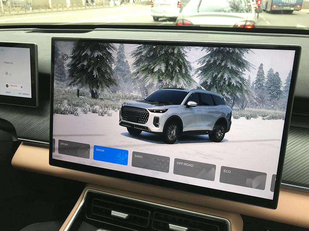 En el EBRO s900 PHEV se puede elegir entre seis perfiles de conducción: Eco, Normal, Sport, Snow, Sand y Off Road. Además de contar con un modo EV (100% eléctrico) o HEV (híbrido). Y por si esto fuera poco, el sistema híbrido enchufable presenta cuatro modos de funcionamiento automatizados combinando todos sus motores.