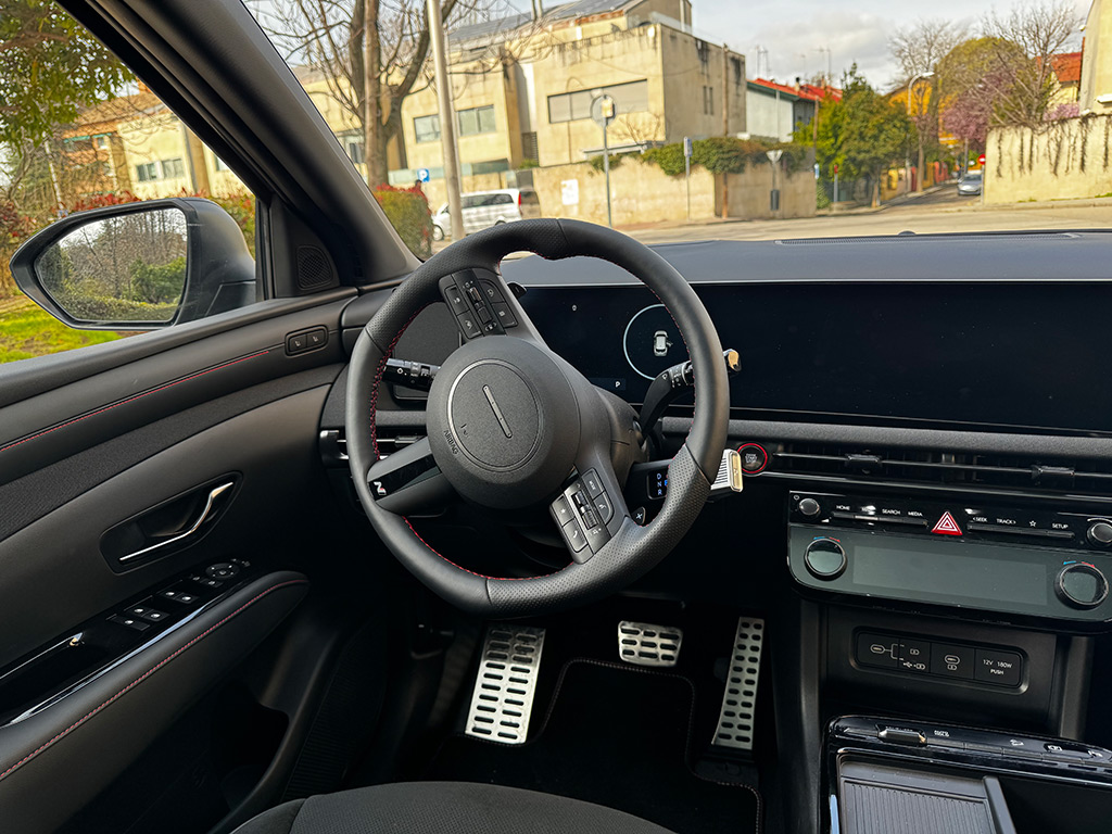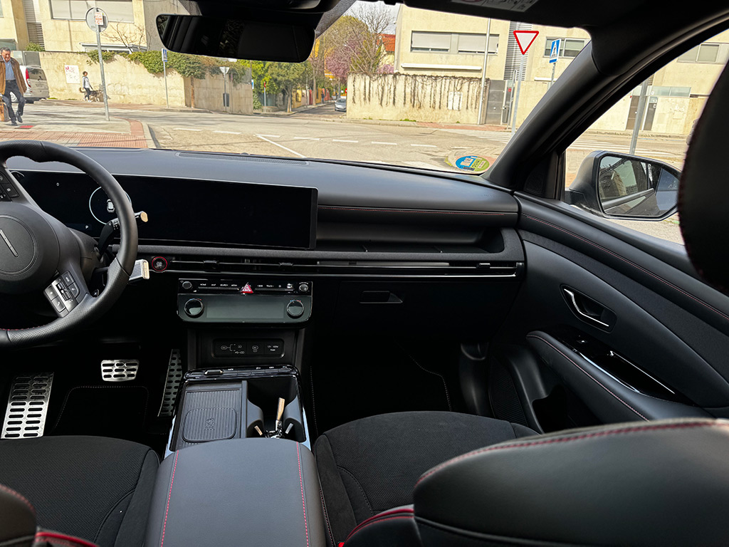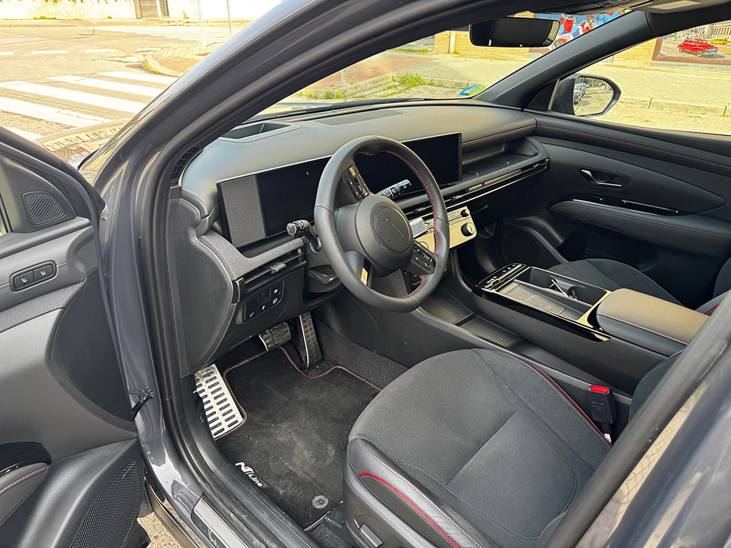 El Hyundai Tucson incorpora materiales de buena apariencia y con unos ajustes muy buenos, que transmiten durabilidad. Presenta un panel único con dos pantallas de 12,3 pulgadas, la de la izquierda, tras el volante, es el cuadro de instrumentos y la de la derecha, en el centro del salpicadero, para el sistema multimedia.