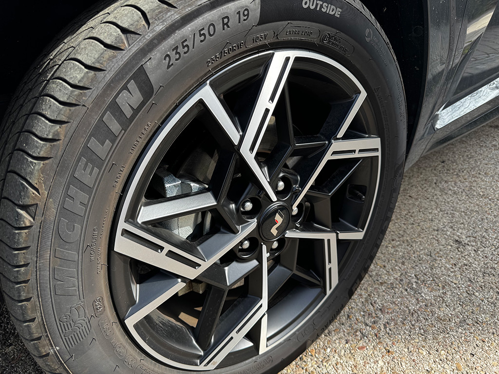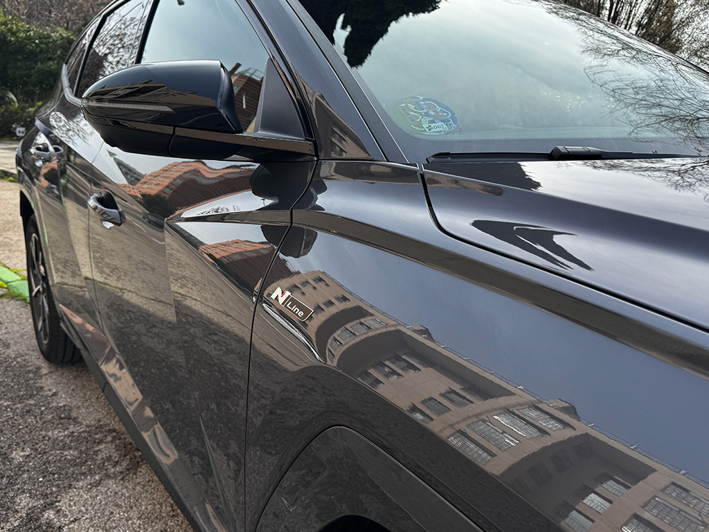 Los de rueda vienen pintados en el color de la carrocería, y el embellecedor entre la tercera ventanilla y el portón del maletero es negro brillante, como las carcasas de los espejos retrovisores, que vienen también en negro. Las llantas de aleación de 19” son de diseño exclusivo N Line, y el spoiler también cambia.