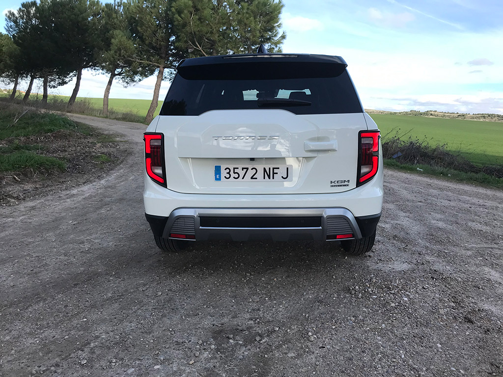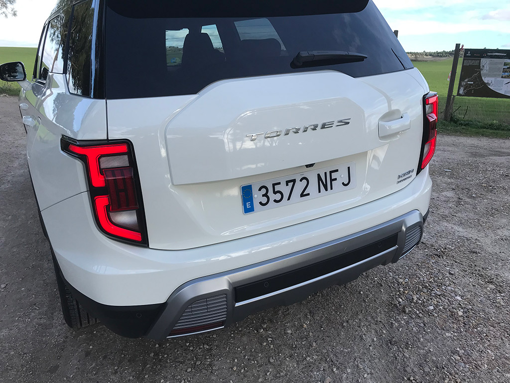 Ademas, encontramos en grande la denominación Torres y el distintivo del modelo a la derecha y discreto logotipo Hybrid que delata que estamos ante la versión híbrida. Por debajo las defensas van en símil aluminio, al igual que en el frontal.
