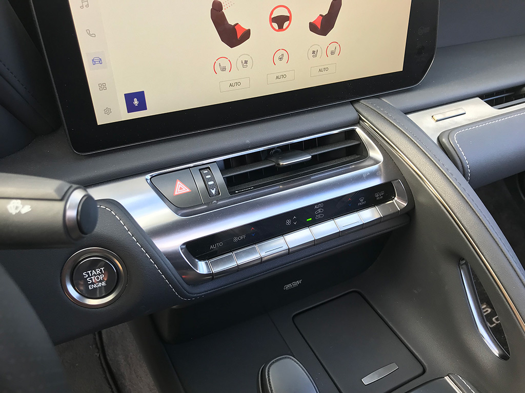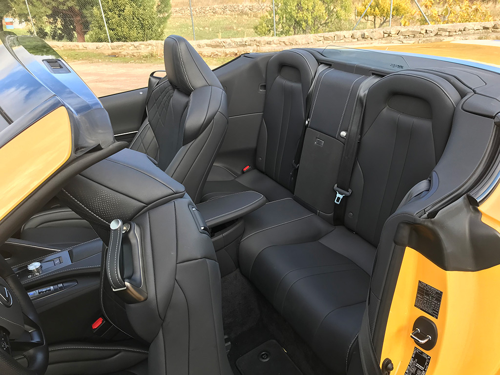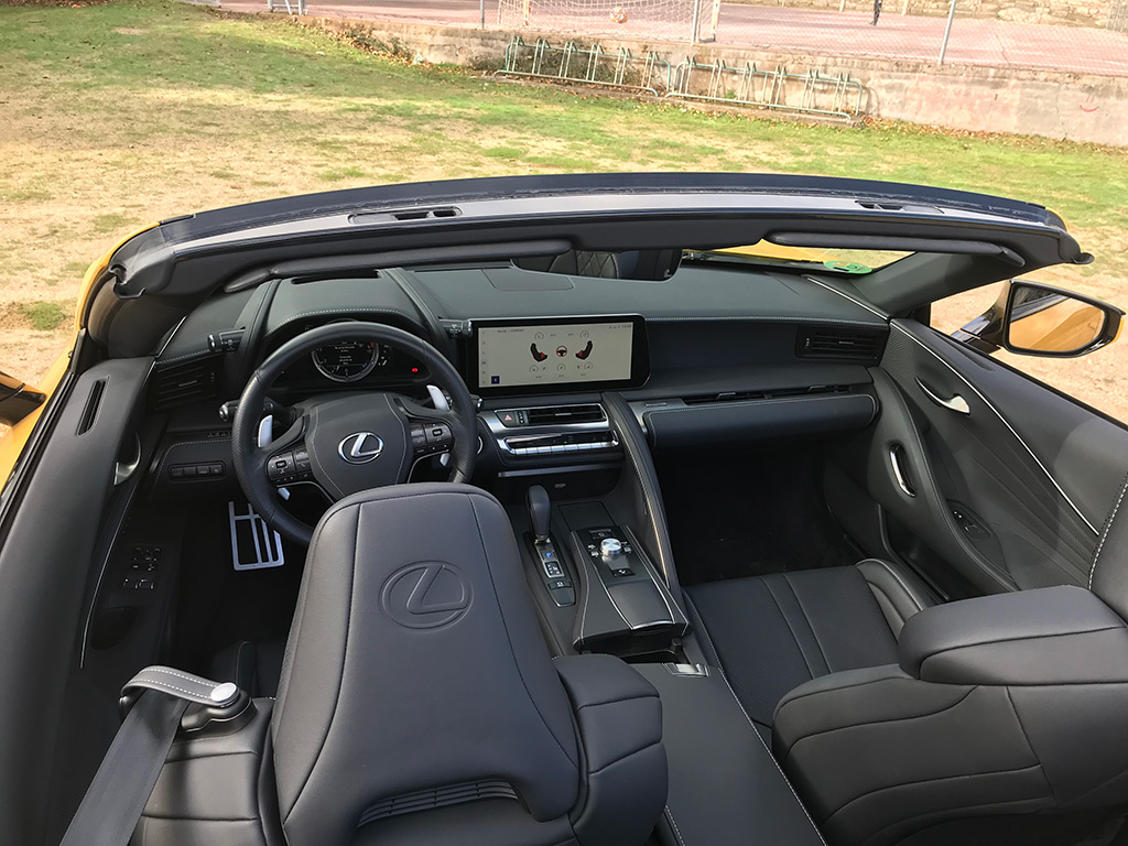 La capota del Lexus LC 500 es de lona y se acciona de manera totalmente eléctrica (con un botón oculto entre ambos asientos) que se puede abrir o cerrar incluso con el coche en movimiento hasta 50 km/h.