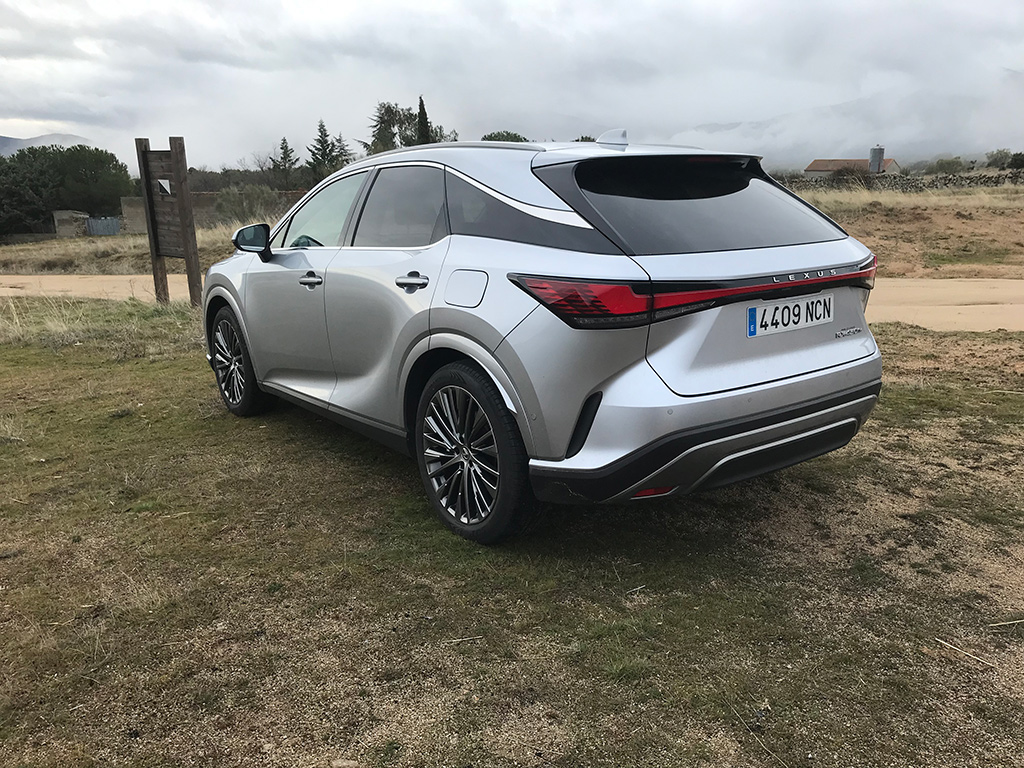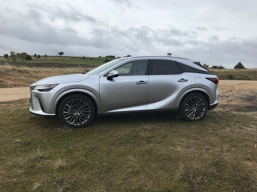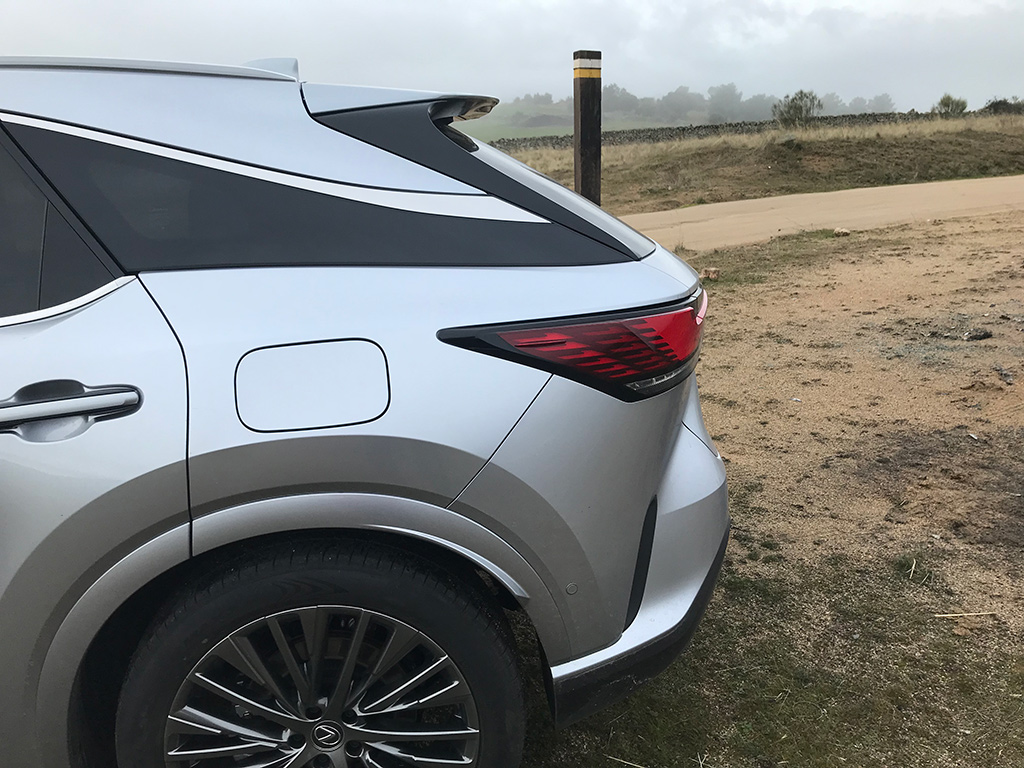 En el lateral del RX 450h+ lo que más llama la atención son las manillas fijas de las puertas con el manejo electrónico E-Latch, además, pasos de rueda sobredimensionados para dar mayor anchura con unos neumáticos que albergan llantas de 21″, y con un pilar trasero oscurecido que da la sensación de techo flotante.
