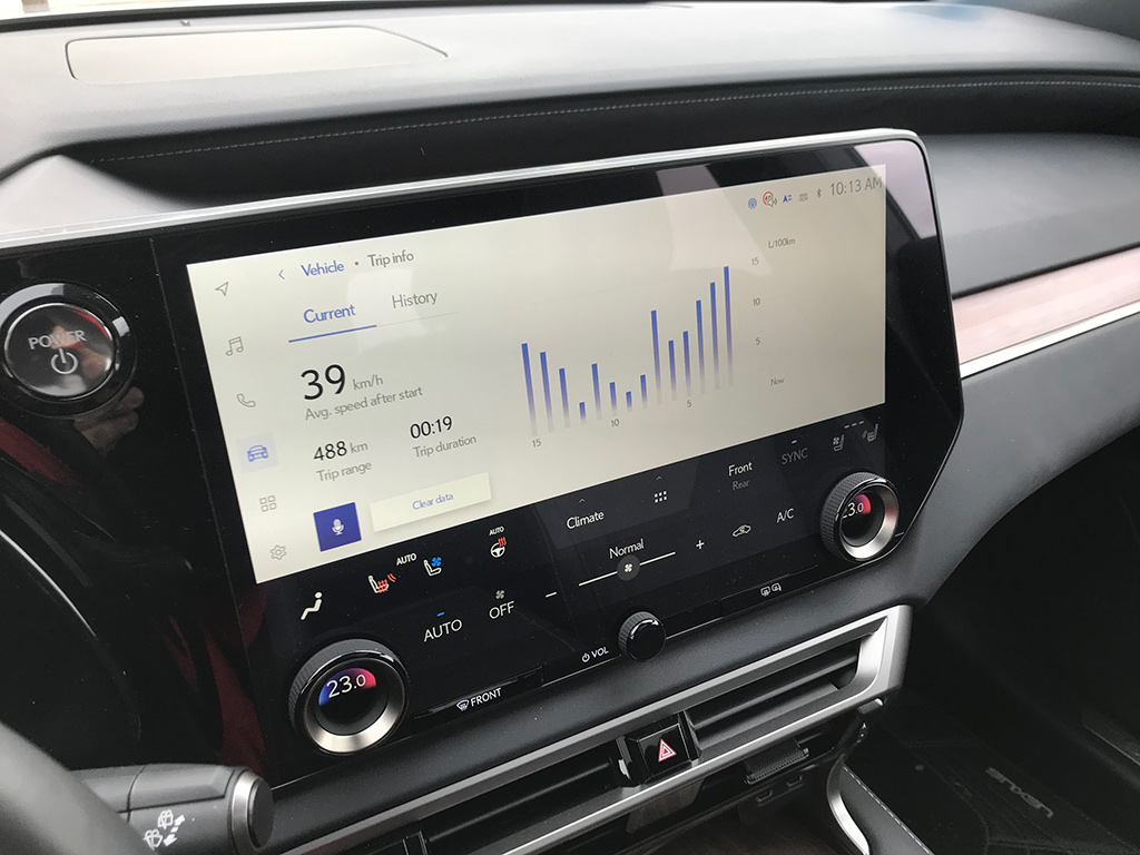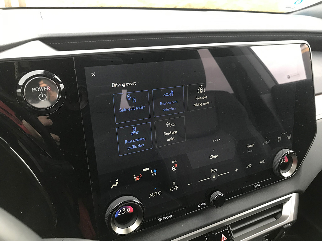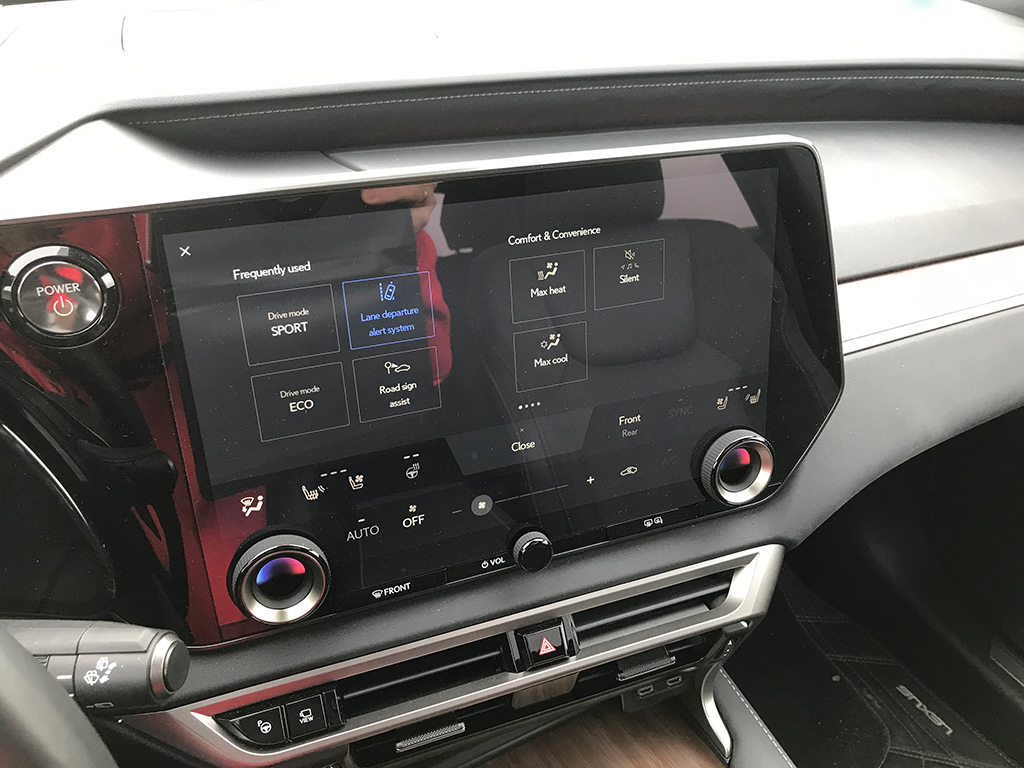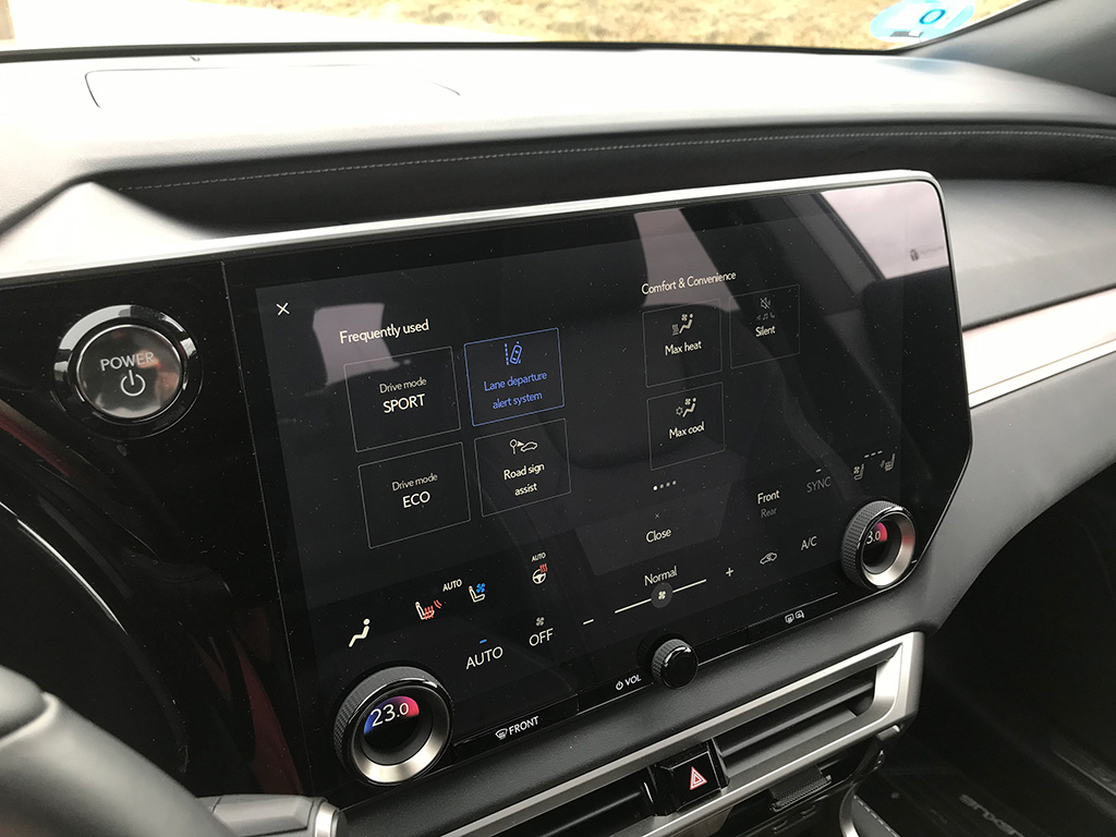 El Lexus RX 450h+ disfruta de conectividad Apple Carplay inalámbrico y Android Auto, asistente de comandos de voz Hey Lexus, actualizaciones OTA y servicios remotos. Desde la gran pantalla controlamos todo lo concerniente al vehículo. La parte inferior de la pantalla lleva los controles de climatización de manera digital o a través de mandos físicos.