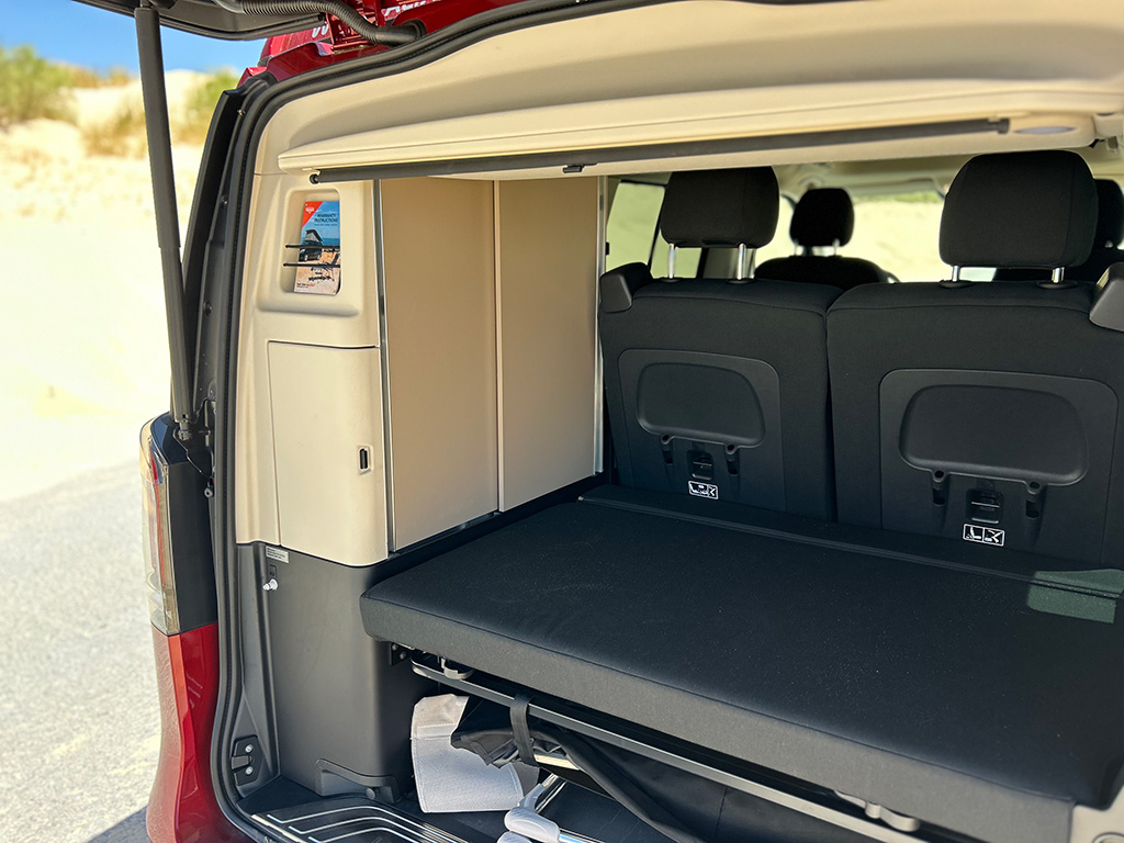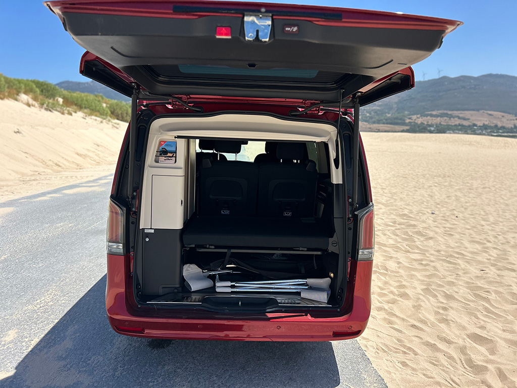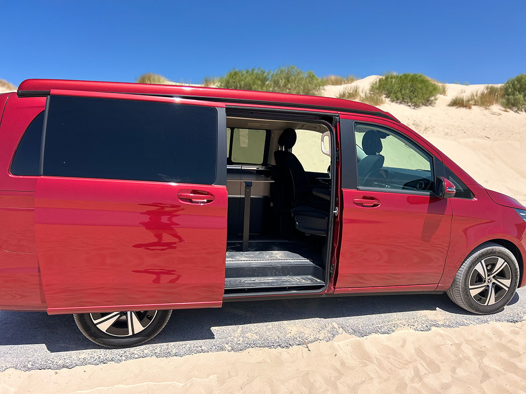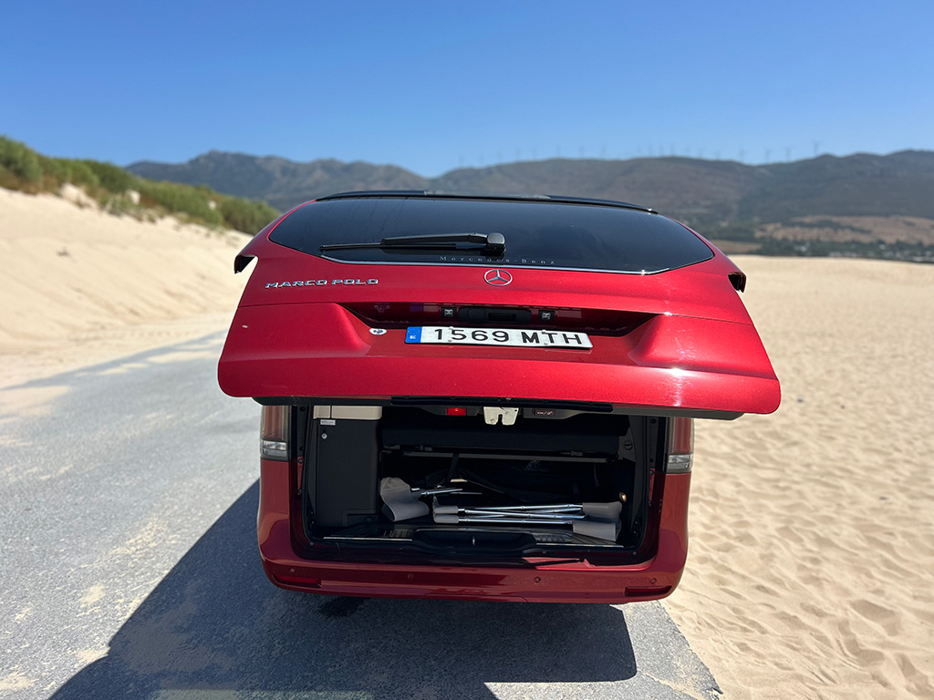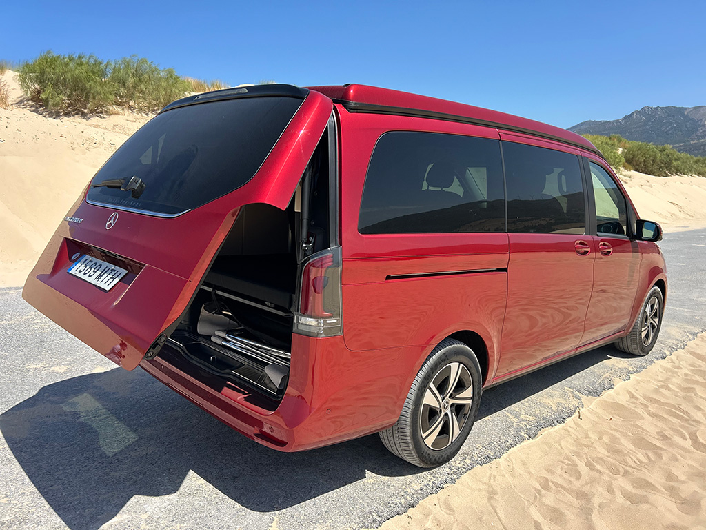 El lateral y la zaga presentan una imagen más plana y tradicional, con esas formas cuadradas típicas de estas carrocerías. Puertas correderas, que en nuestra unidad se abren y cierran eléctricamente para una apertura y cierre mucho más cómodo. El techo desplegable, de serie, EASY-UP permite abrir y cerrar la cama desplegable sin esfuerzo desde el interior del vehículo con pulsar un botón.