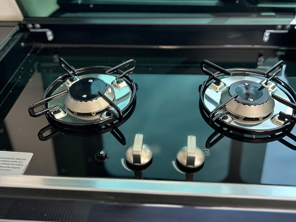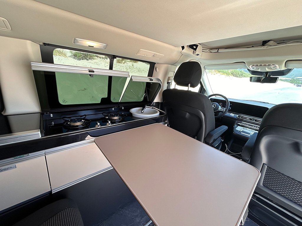 - La cocina es muy funcional, de gas con dos quemadores, frigorífico y fregadero con cubeta extraíble. Las cubiertas de las zonas de trabajo individuales son de cristal ahumado de seguridad fácil de mantener, se pueden abrir individualmente y ofrecen zonas de almacenamiento flexibles