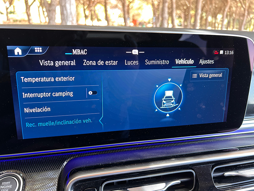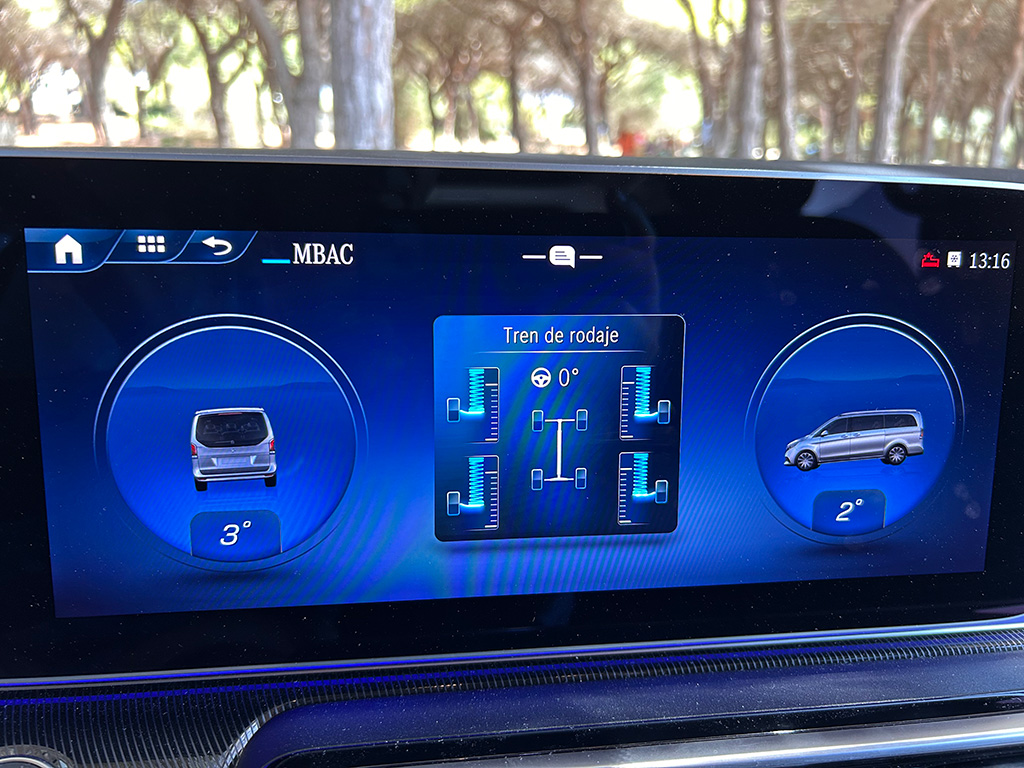Uno de los aspectos más destacables de la Marco Polo es la suspensión neumática AIRMATIC, el control de nivel Camper compensa automáticamente los pequeños baches de la carretera. Y es que además, con el Control de nivel AIRMATIC plus Camper, cuando vamos a acampar, nuestra Clase V Marco Polo, se nivela automáticamente.