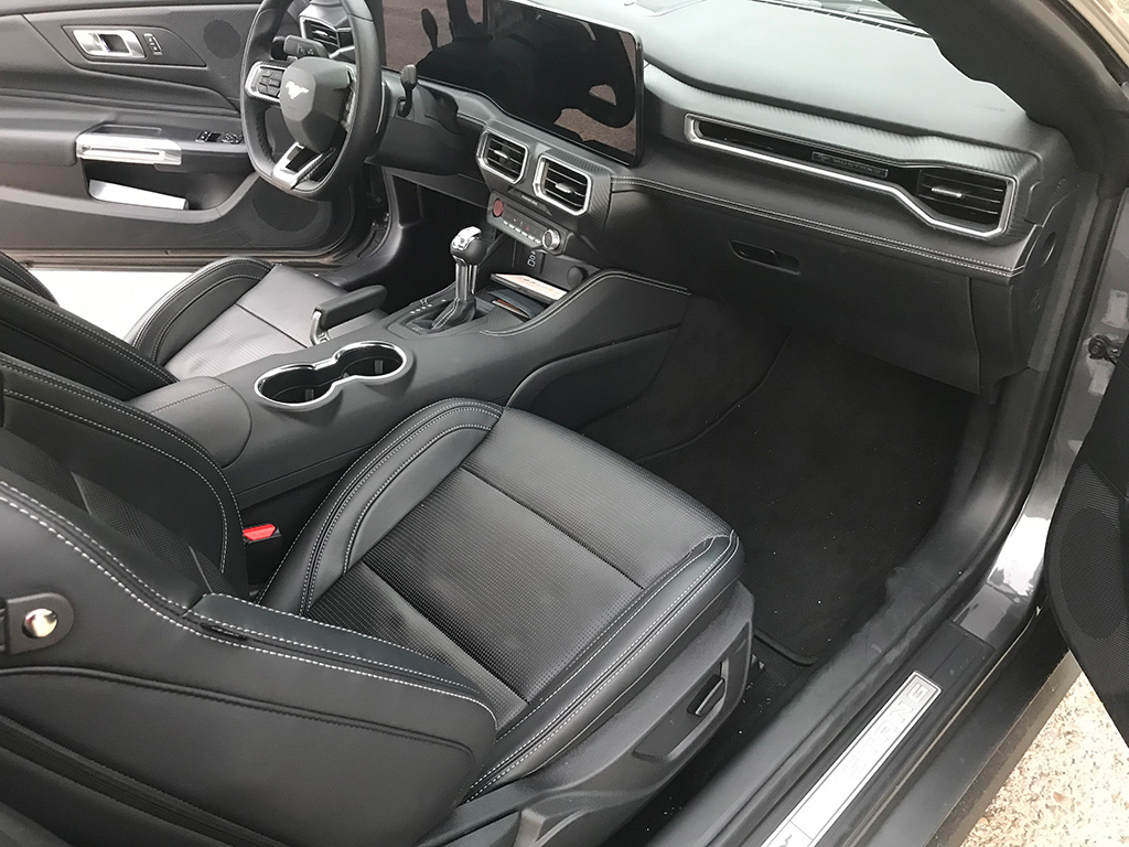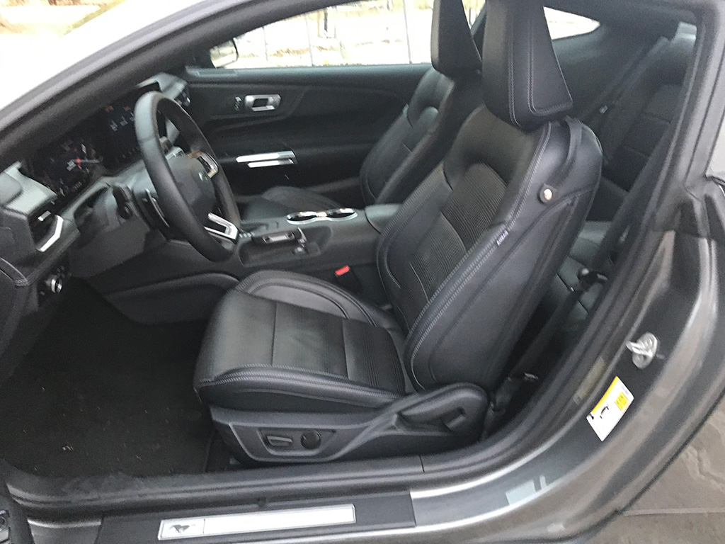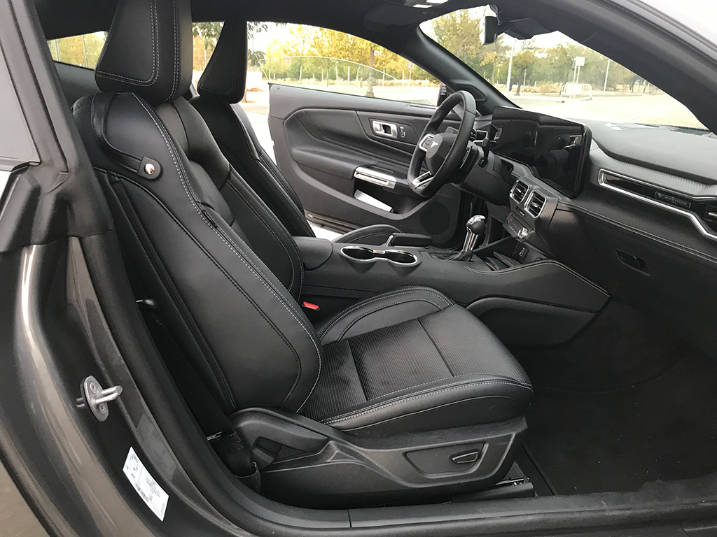 El Mustang GT equipa unos cómodos asientos delanteros de cuero, regulables (con la posibilidad de ser calefactables y ventilados) con ajuste lumbar y entre ambos, el tronco central, cambio, dos posavasos y la palanca del freno de mano.