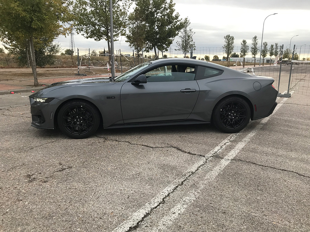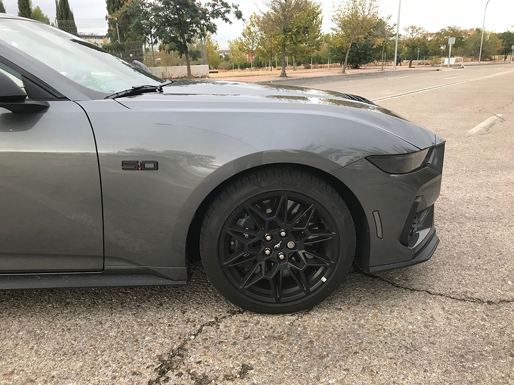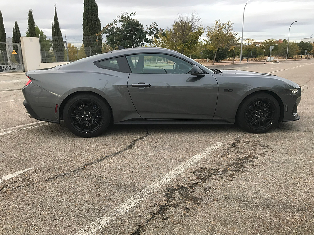 Visto de lateral mantiene ese perfil inconfundible del Mustang, un coupé muy, muy bajo, con un pilar A muy tendido y la línea del techo extremadamente suave. El pilar B se ha ocultado para mejorar la silueta. Marcados pasos de rueda con neumáticos Michelin Pilot Sport 4 S en medidas 255/40 ZR19 100Y en el eje delantero y 275/40 ZR19 105Y en el trasero y frenos Brembo de 6 pistones. Además el logo 5.0 a cada lado, seña de identidad de su motor.