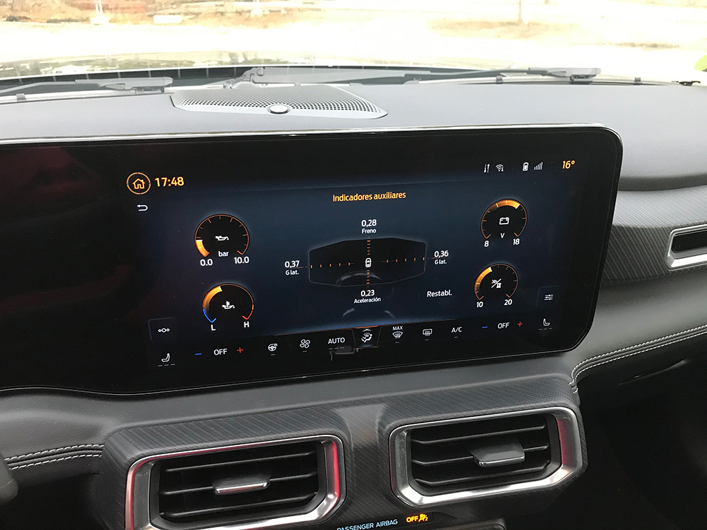 El sistema de pantallas sufre un cambio total. pantalla de instrumentación digital de 12,4 pulgadas tras el volante y una pantalla táctil central de 13,2 pulgadas orientada hacia el conductor, crea una sensación de cabina de avión (el software de juegos Unreal Engine soporta gráficos animados interactivos).