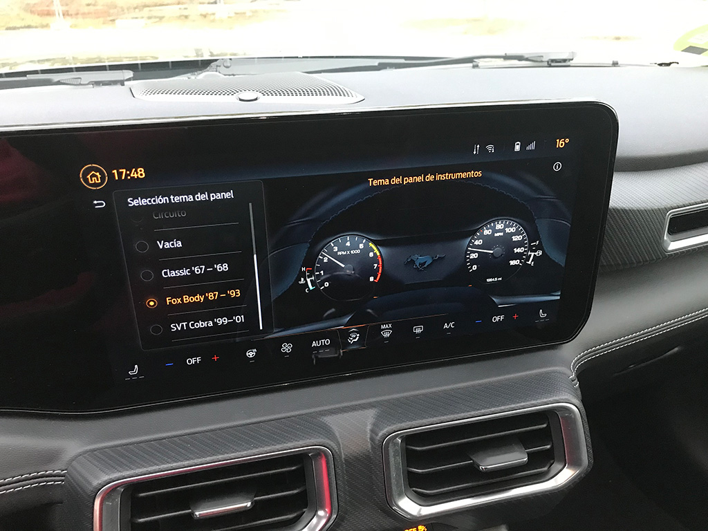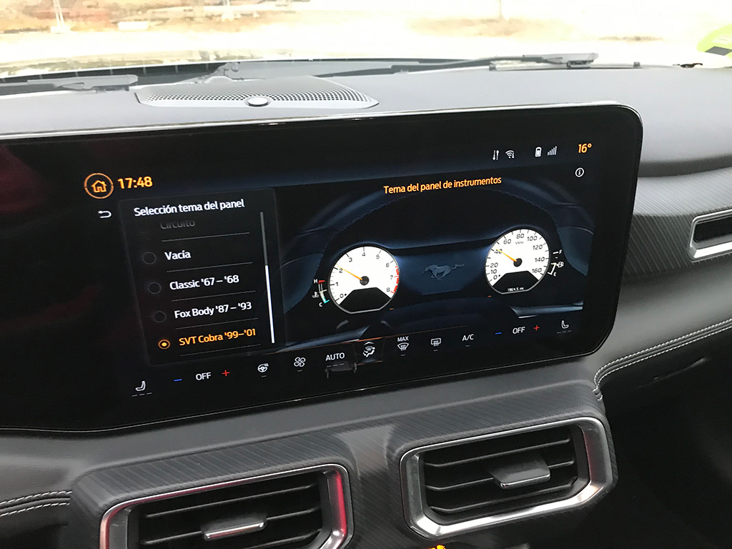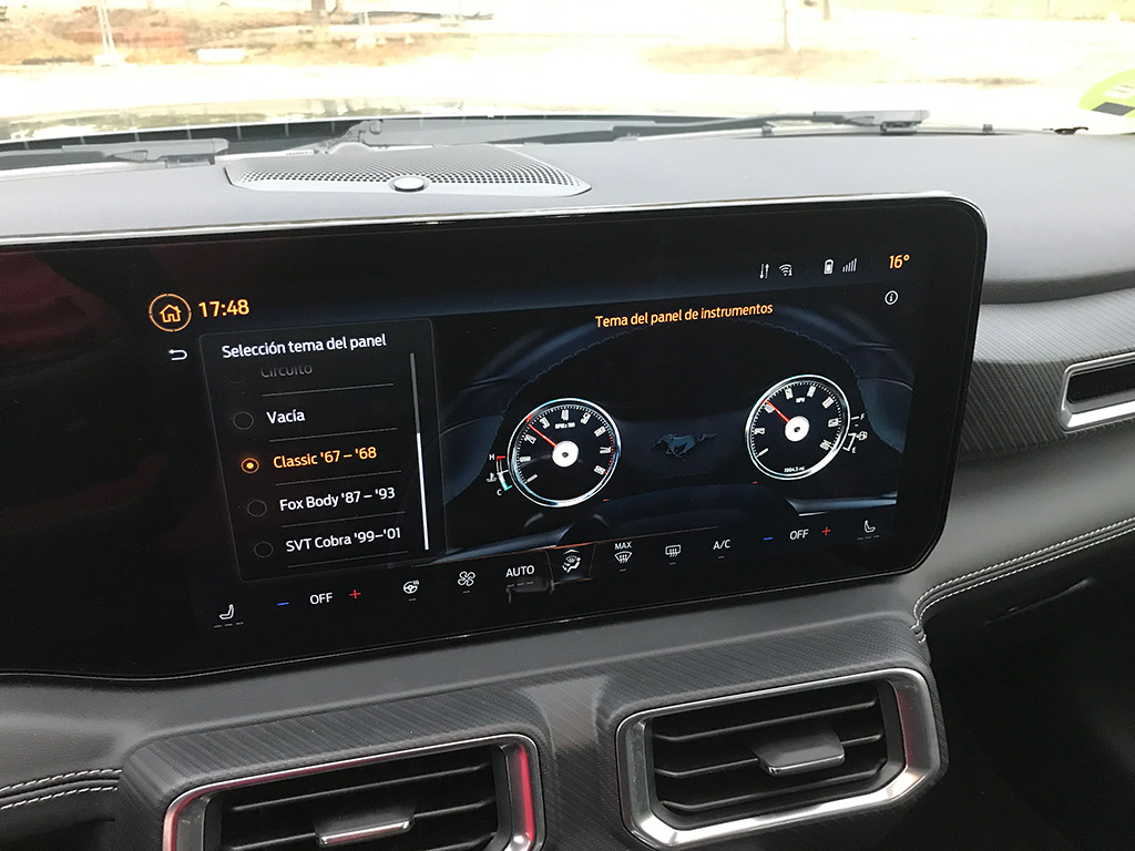 Entre las innumerables configuraciones y posibilidades de personalización que tiene el nuevo Mustang, podemos destacar, la posibilidad de convertir la instrumentación en algunos de los diales más representativos en la historia del Mustang adoptando la instrumentación del Mustang clásico de 1967, el del Fox Body ochentero o la del SV Cobra de 1999.