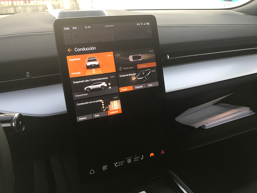 Empezamos nuestra ruta y nuestro copiloto se encarga de buscar el modo de conducción adecuado. Sorpresa, porque ya no encontramos los típicos modos de conducción, sino que desde Polestar han pensado, que mejor ajustes tú los parámetros principales, como pueden ser la dirección, suspensiones, motor,… Además el Polestar 3 incluye la función one-pedal y un reparto del par vectorial para el eje trasero, que funciona a modo de autoblocante en las curvas.