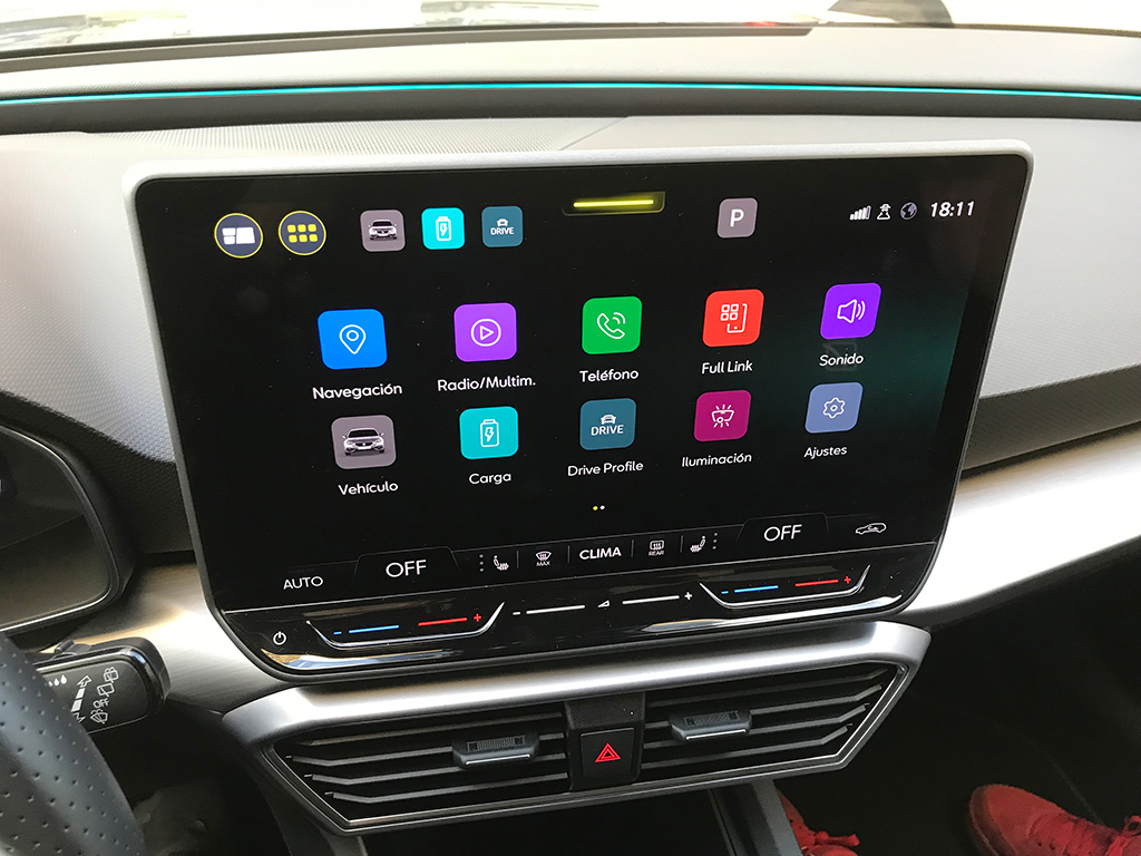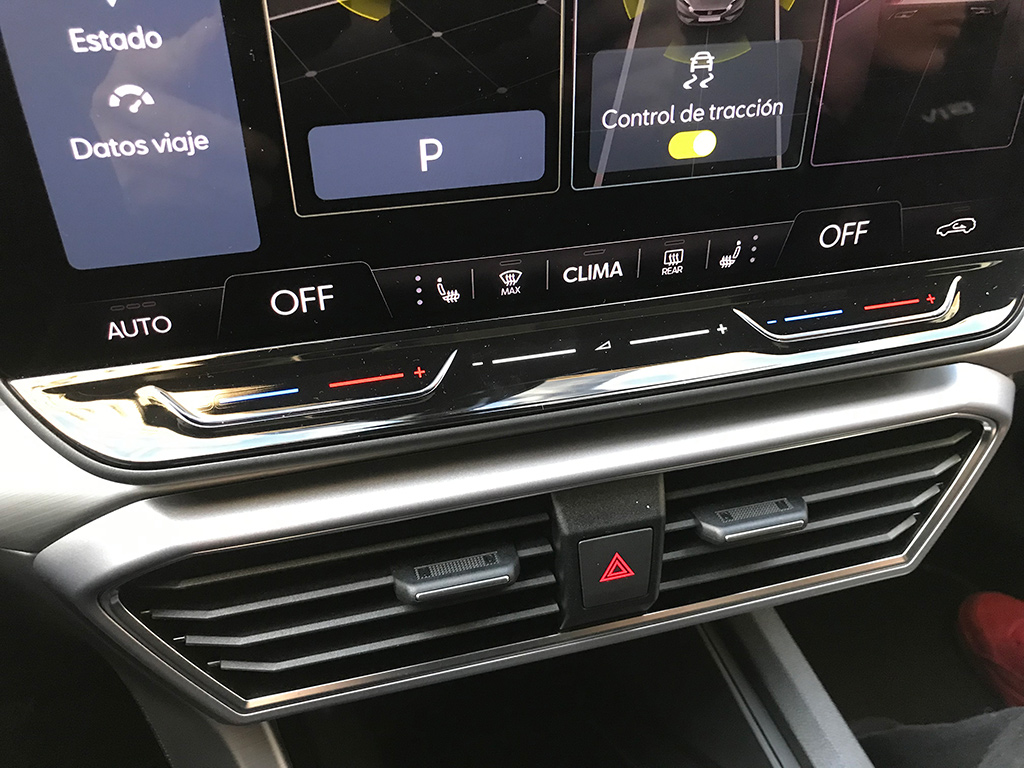 Destacar que los mandos de climatización están sacados de la pantalla y se iluminan por la noche. Además incorpora Head-up Display de proyección digital en el parabrisas, con realidad aumentada, con una visión muy clara y concisa.