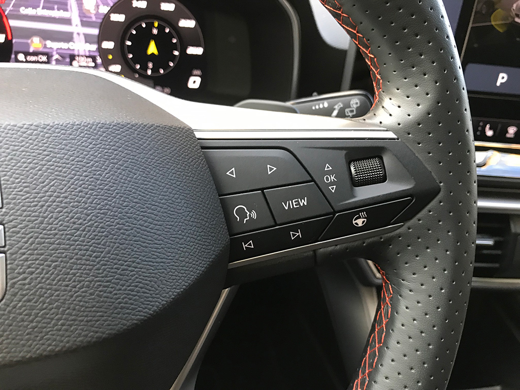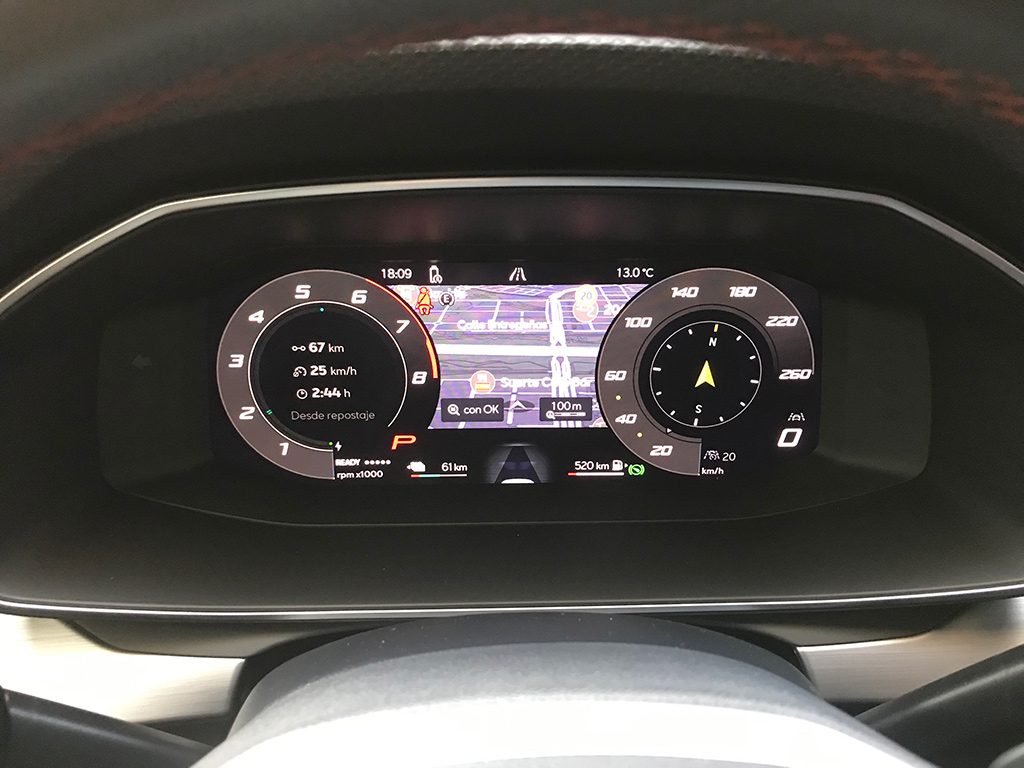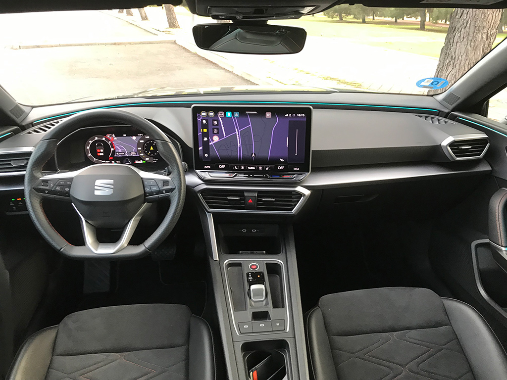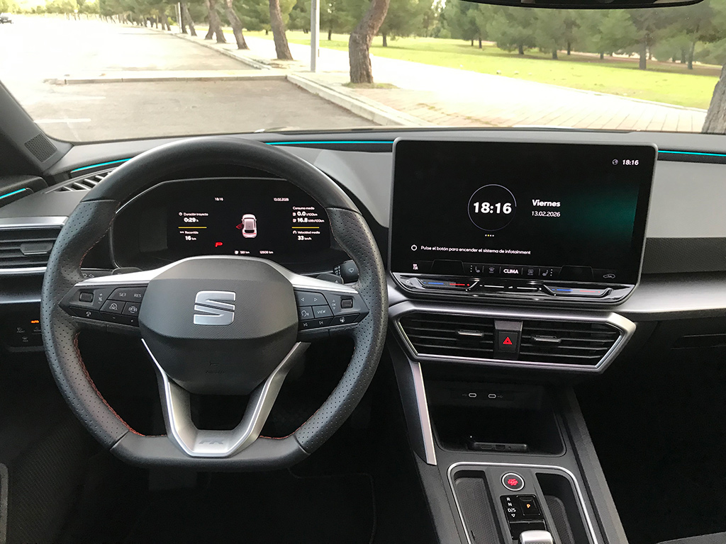 En el interior del León encontramos todo perfectamente ubicado. La instrumentación digital configurable Virtual Cockpit de 10,25 pulgadas tras el volante, tiene una visión muy clara y definida de los parámetros de conducción (como en sus compañeros de grupo). El sistema multimedia es a través de una pantalla de 12,9 pulgadas, donde se accede a las principales funciones del vehículo, con unos gráficos excelentes y un manejo muy fluido y sencillo.