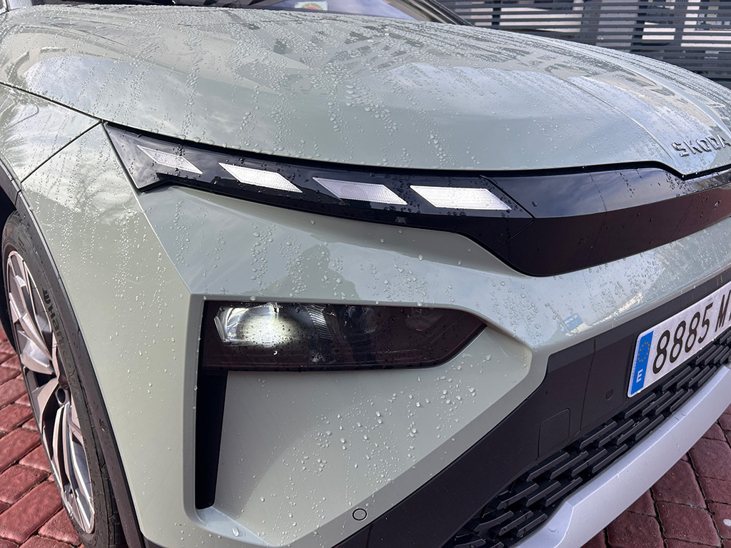 A ambos lados, el Elroq cuenta con faros de tipo LED, pudiendo montar opcionalmente unos Matrix LED (que hemos probado en el VW Tayron) con cinco modos de luz adaptativos. Los estrechos segmentos superiores sirven como DRL, luces de posición e indicadores; y los módulos inferiores integran las luces de cruce y carretera.
