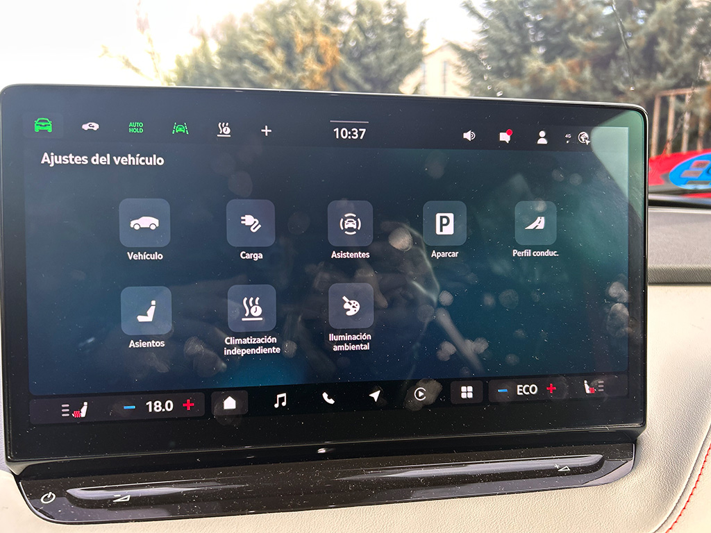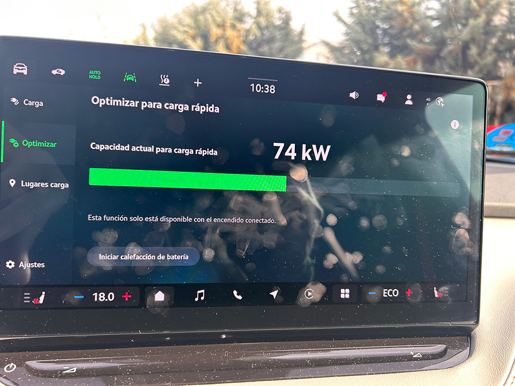 Algo de lo que nadie se percata, pero que es muy importante es el precalentamiento de la batería, y en este Škoda Elroq, la batería cuenta con un sistema de precalentamiento para la carga en CC, que podemos activar de forma manual o seleccionando un punto de carga en el navegador, con lo cual al llegar al punto de carga, nuestro Elroq siempre se va a cargar de manera óptima.